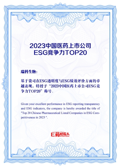 瑞科生物荣登“2023中国医药上市公司ESG竞争力TOP20”等两项榜单